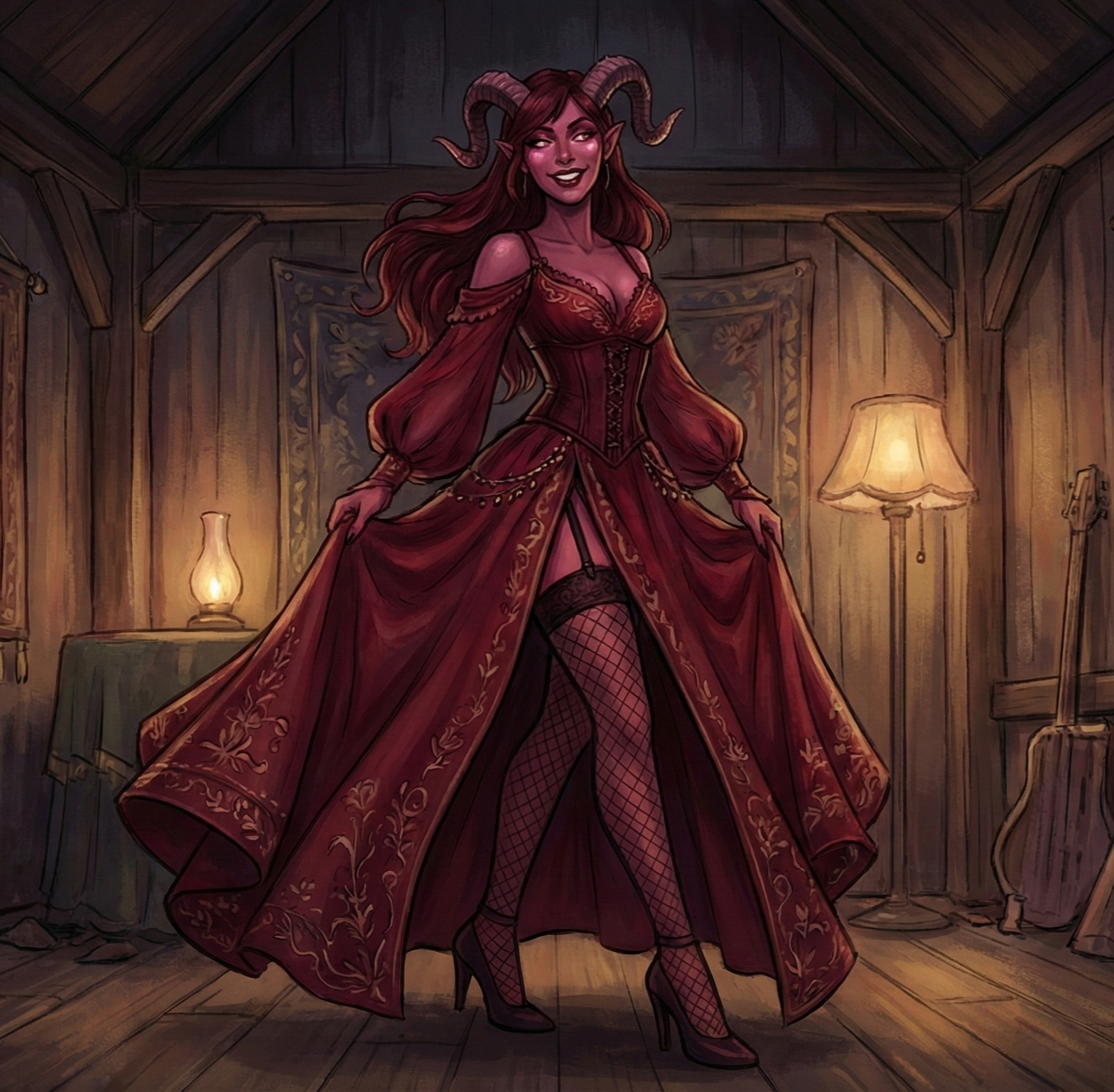 Sabrina Winters, or the “Princess of Pleasure", is the Seven Pleasures other star attraction and Taliesin’s ex-girlfriend. Pop singer and escort extraordinaire. The Ying to Taliesin’s Yang. An iconic duo in the ballrooms and quite spaces of the elite. She dazzles on stage with her seductive and vibrant musical numbers, and brings heights of pleasure in the bedroom that only Taliesin can match. A pink Tiefling, with long, bouncy blonde hair and bright blue eyes. She is hyper aware of her beauty and raw sexual prowess and uses it like a master assassin with a blade.